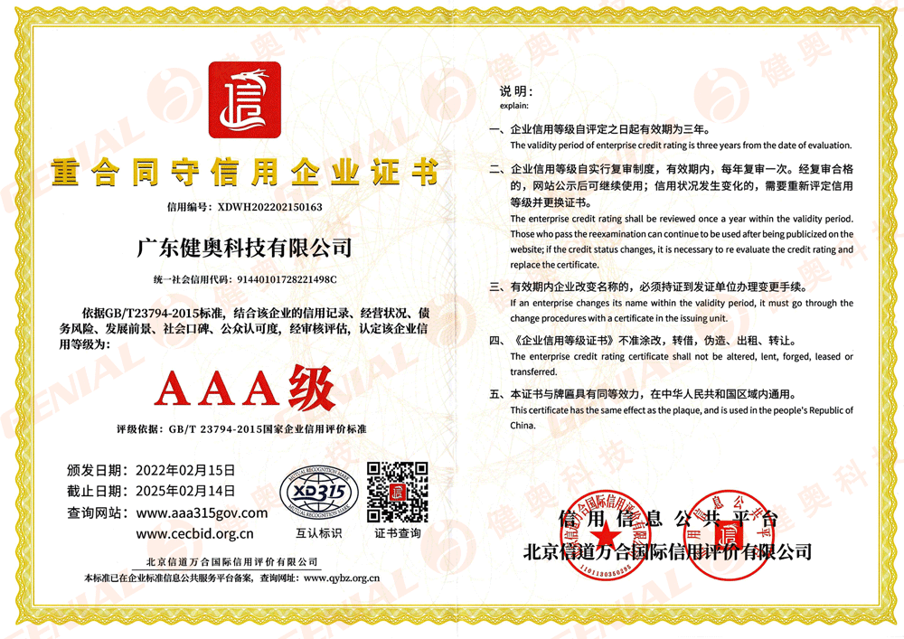 2022年2月,健奧科技被評為企業信用評價AAA級信用企業,標志著公司企業信用建設再上新的臺階!!
